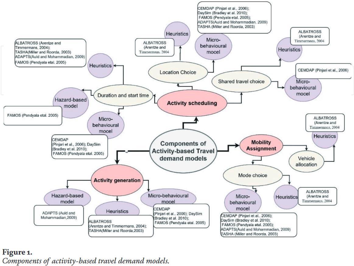 Traditional transport demand models; 4 stage models, have evolved from trip-based to tour-based to activity-based models. Activity-based models assume that a person’s need to travel is based on what activities they are involved in. The key difference in these models is that they don’t look at trips at an aggregate level, but rather at an individual level, taking into account all the trips and activities of the day based on a time sequence.